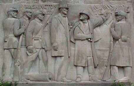 Washington Panel at Lincoln Boyhood Memorial, IndianaHere we see Abraham Lincoln depicted during his years as Commander-in-Chief (1861-1865) with General Ulysses S. Grant. They are surrounded by Union soldiers at Grant's temporary headquarters in Petersburg, Virginia.